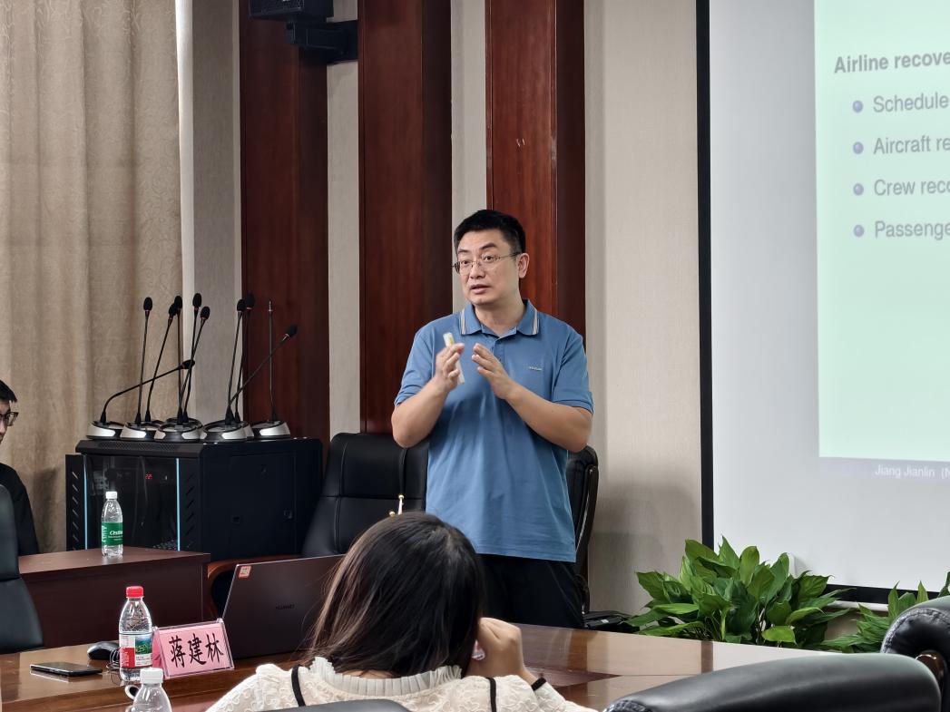 举行数海领航大讲堂2025年第22期。本期讲座邀请了南京航空航天大学蒋建林教授为全院师生带来了一场题为“Sparse-denseflightcopy-based interactive mechanismtoairlineintegrated recoverywith cruisespeedcontrol”的学术讲座。讲座由我院副院长郑松教授主持,学院部分教师与研究生参加了此次讲座。